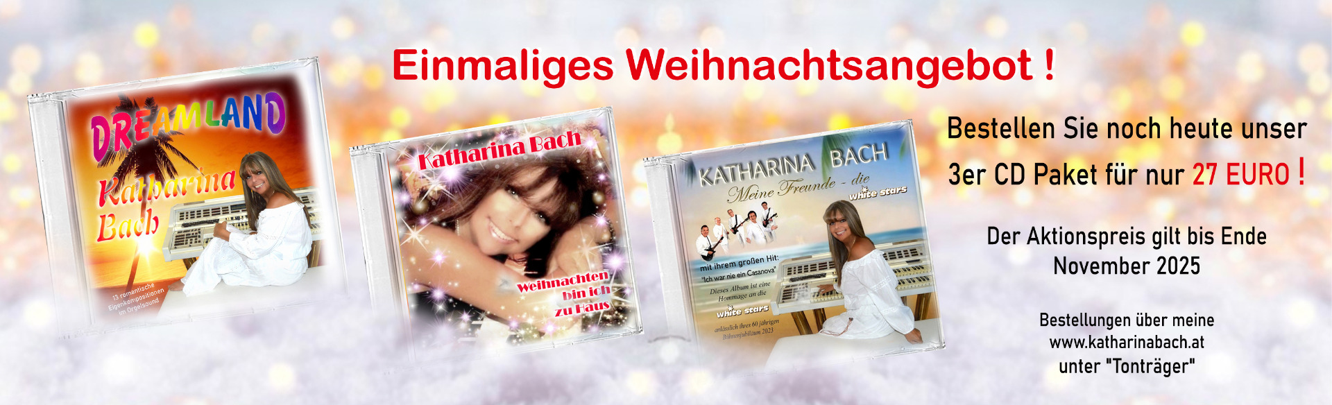 Gleich 2 Alben kommen von mir noch vor Weihnachten auf dem Markt - "DREAMLAND" mit 13 romantischen Eigenkompositionen, sowie mein Weihnachtsalbum "WEIHNACHTEN BIN ICH ZU HAUS" wo es schon zu beiden Tonträgern kurze Hörproben dazu auf YouTube gibt.Wer Interesse an beiden CD´s hat, kann diese jetzt schon vorbestellen unter CD-bestellung@gmx.at Rechtzeitig zu Weihnachten darf mein Weihnachtsalbum natürlich nicht fehlen - die CD enthält 18 bekannte Weihnachtslieder, wo ich extra ein dazupassendes Weihnachtsarrangement geschrieben habe.Für verträumte Romantiker ist mein Album "DREAMLAND" genau das richtige, wo ich 13 Eigenkompositionen an meiner Orgel eingespielt habe.Alle Aufnahmen von meinen beiden CD´s wurden LIVE und ohne Mehrspurverfahren aufgenommenWer beide CD´s bestellt, erhält Rabatt, wer noch mein jüngstes Album "MEINE FREUNDE - DIE WHITE STARS" dazu nimmt, erhält zusätzlich einen Sonderrabatt.Der Aktionspreis gilt bis Ende Dezember 2024 - näheres auf meiner www.katharinabach.at unter "TONTRÄGER"Genießen Sie daher die Vorweihnachtszeit mit meinem Album "WEIHNACHTEN BIN ICH ZU HAUS´" !